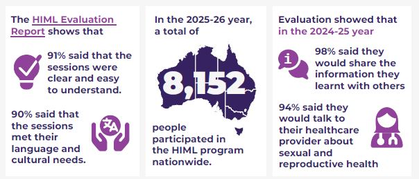 Continue to deliver HIML in each state and territory, with an increased breadth of topics and increased reach in each jurisdiction, including migrant and refugee men, PALM scheme workers, young women, international students, and more newly arrived communities. In addition, investigate and develop options to formalise and extend the national Bilingual Health Educator workforce.