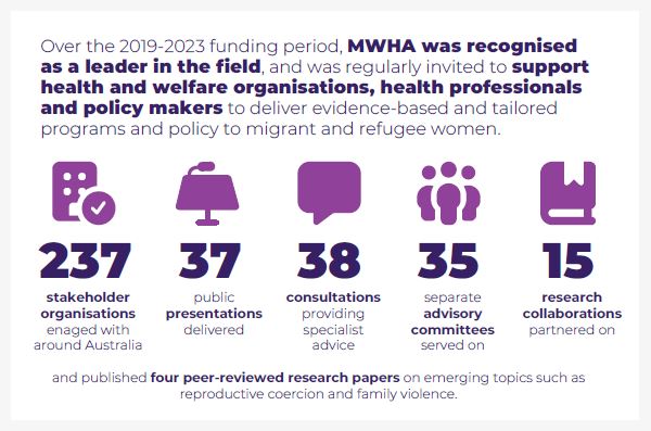 MCWH is uniquely placed to lead national capacity building efforts, having robust theoretical expertise, practice experience and sustained relationships with migrant organisations, women and communities fostered through over 45 years of experience working in women’s health and the multicultural sector.